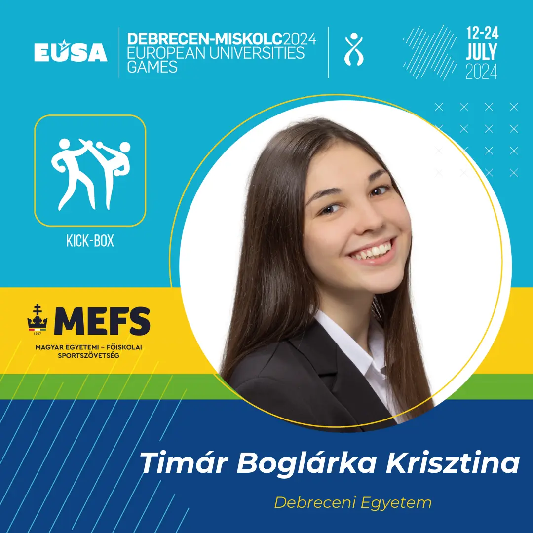Pénteken az 65 kg feletti súlycsoportban versenyző kick-boxoló a második menetben technikai K.O.-val győzte le ellenfelét, a török Seyma Nur Akdemirt, így szombaton már az aranyéremért léphetett a kötelek közé Miskolcon. A szombati finálé második menetében a DE sportolója a szemére kapott rúgást, az ebből származó sérülés miatt pedig feladni kényszerült a TF-es Kovács Laura Fanni elleni küzdelmet. Ezüstérmére nagyon büszke a Debreceni Egyetem közössége! Bravó, Boglárka!